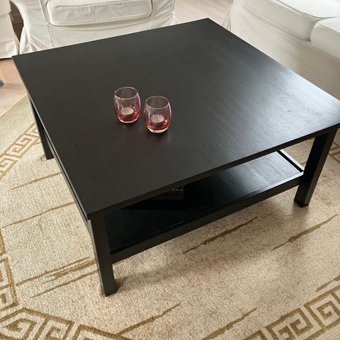 Mørkebrunt sofabord med skuffe fra IKEA. En del brugsspor på bordpladen.
