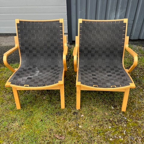 2 super fede vintage IKEA stole, model Sälen. Designet af Knut og Marianne Hagberg i starten af 1980’erne. 1 lav og en 1. Fremstår i virkeligt pæn stand. Ingen store hakker eller ridser i træet. Metallet er ligeledes i rigtigt pæn stand. Der medfølger originale hynder der trænger til nyt betræk.