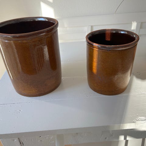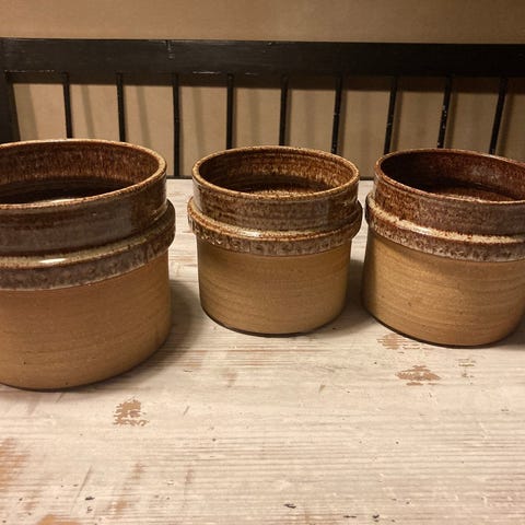 Syltekrukker sæt i keramik i brune nuancer. En af krukkerne har låg og små hanke i siderne. Krukkerne kan anvendes som dekoration, opbevaring eller urtepotter. På en af krukkerne ses en afslagsskade på kanten, som fremgår af billedet. (Den største af dem)