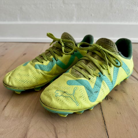 Puma fodboldstøvler str. 33 i hvid med sorte Puma-logoer og detaljer i turkis og pink på sålen. Overdel i syntetisk materiale og knopsål egnet til brug på græsbaner. Indvendig foring i mørk farve. Velegnet som fodboldstøvler til træning og kamp.