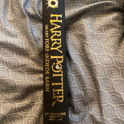 Harry Potter og det forbandede barn bog i hardback-udgave. Bogen har sort omslag med guldfarvet tryk på ryg og forside. Velegnet til læsning for børn, unge og voksne, der følger Harry Potter-universet. Teksten er på dansk.