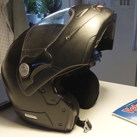 Caberg Duke Legend motorcykelhjelm i størrelse S, passer til hovedomkreds 55-56 cm. Hjelmen er i farverne orange og sort med klart visir. Vægten er angivet til ca. 1550 g ± 50 g, med mulighed for ekstraudstyr op til 1600 g. Velegnet som integral-/flip-up-hjelm til motorcykelkørsel. Modeloplysninger og størrelsesdata fremgår af mærkaten på hjelmen.