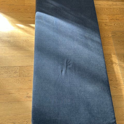 IKEA seng i grå farve med polstret ramme og træben. Sengen er egnet som enkeltseng i soveværelse, gæsteværelse eller børneværelse. Overfladen er plan og kan anvendes med topmadras eller almindelig madras efter behov.