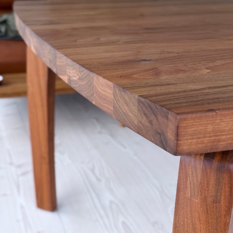 6 stole med løse læderhylder og 2 med armlæn og fastmonteret læderhylde. Alle er af valnød, model Bilbao.
