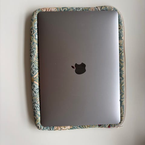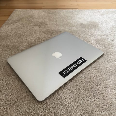 Apple MacBook Air 13" laptop i sølv. Modellen er fra 2017 med 13" skærm. Den kører macOS Catalina. Ifølge skærmbilledet har den en 1,8 GHz dual‑core Intel Core i5‑processor, 8 GB 1600 MHz DDR3 RAM og Intel HD Graphics 6000. Lagerpladsen er angivet til ca. 120 GB SSD. Medfølgende oplader ses på billederne.