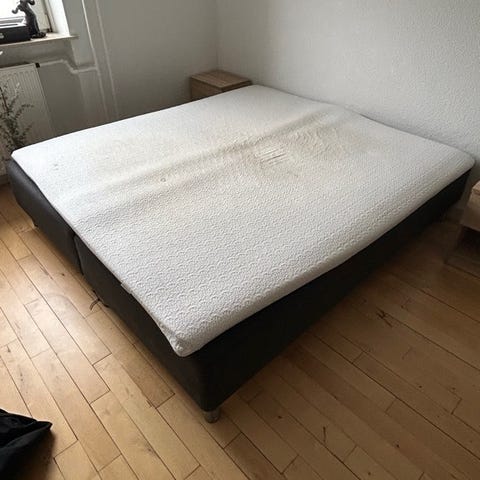 IKEA Stavanger seng (140x200). Boksmadras med tilhørende ben i to forskellige længder.