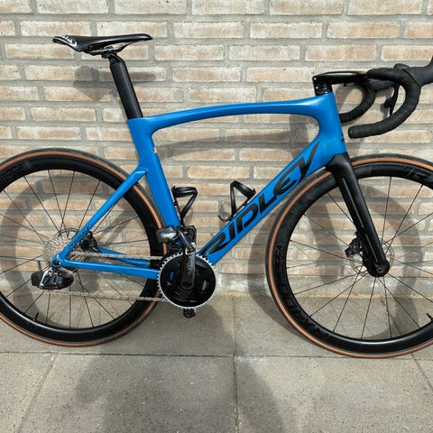 Sælger denne super fede og hurtige Ridley Noah Fast i en flot blå farve. Cyklen er en rigtig fuldblodsracer med 55 mm carbonhjul, elektronisk Shimano Ultegra-geargruppe, integreret carbonstyr og integreret Garmin-mount.