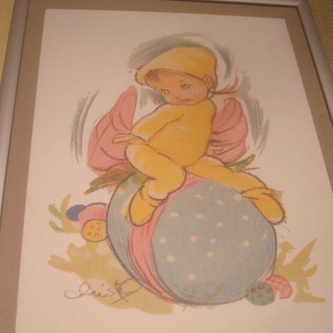 Lille pige med barnevogn. Måler 42 x 42 cm.