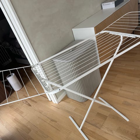 En original vægmonteret sammenklappeligt og udvideligt tørrestativ, som forbliver helt skjult, når det ikke er i brug, for at udnytte pladsen optimalt.