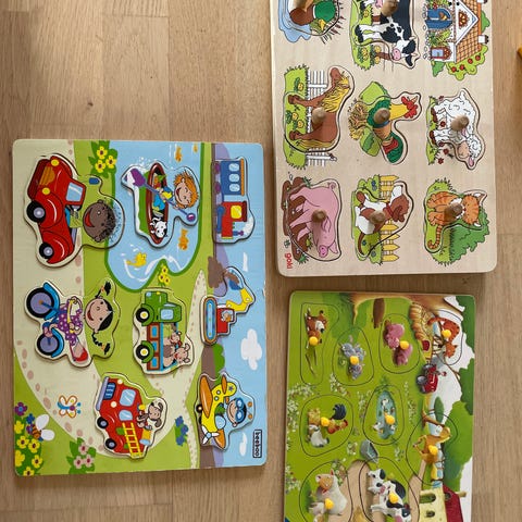 Puslespil sæt med flere brikker og motiver af farverige sommerfugle og prinsesser. Sættet består af seks enkelte puslespil med forskellige illustrationer, som kan lægges hver for sig. Egnet til børn, der øver finmotorik og motivgenkendelse. Velegnet til indendørs leg på bord eller gulv.