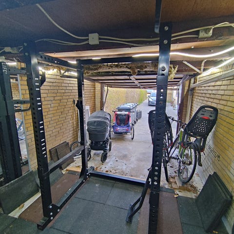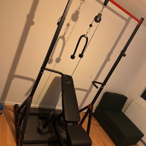 Meget billigt pull up træningsstativ i sort og rød metalramme inkl. skumgulv. Stativet har vandret pull up-stang øverst samt to sidehåndtag til forskellige kropsvægtsøvelser. Konstruktionen består af kraftige firkantrør med boltesamlinger og brede fødder for stabilitet. Egnet til hjemmetræning af overkrop, fx ryg, arme og skuldre, og kan placeres indendørs på fast underlag. Billede med alle mål er vedhæftet. Stativet er delvist usamlet men alle tilhørende bolte og skruer er gemt og det er nemt at samle.