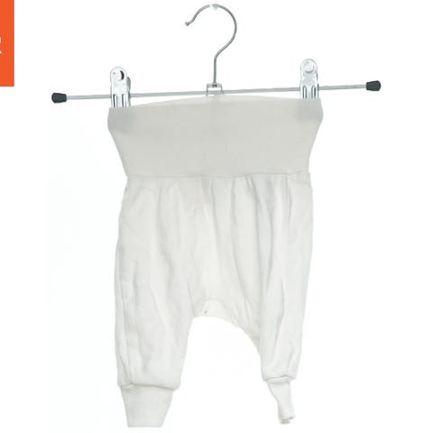 Et par ribbede babybukser i lysegrå farve. Bukserne har en elastisk talje og er lavet af et strækbart materiale. Ingen synlige mærker eller stempler angiver størrelse eller brand.
