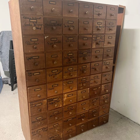 Gammelt arkivskab i nøddetræ med alle skuffer. Der er patina i toppen og originale etiketter på skufferne.
