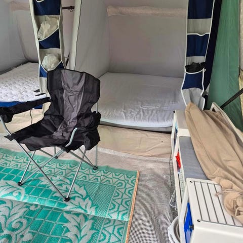 Det indbyggede køleskab er defekt og er afproppet, da der blive lavet gasafprøvning for 2 år siden. Der medfølger et ekstern køleskab.