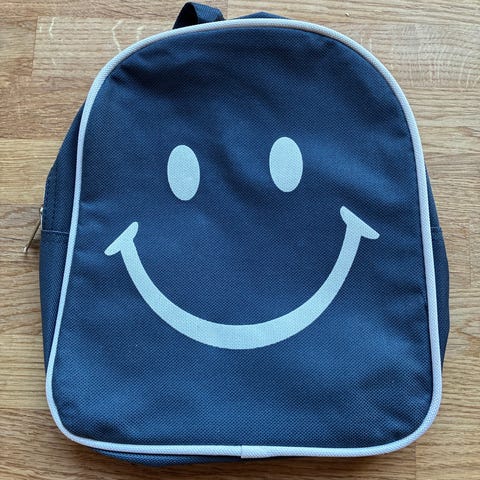 Lyseblå med motiver som rulleskøjter, høretelefoner, pizza og milkshake. God kvalitet. Indeholder et stort rum og to små rum foran. Har dejligt bløde og solide seler.