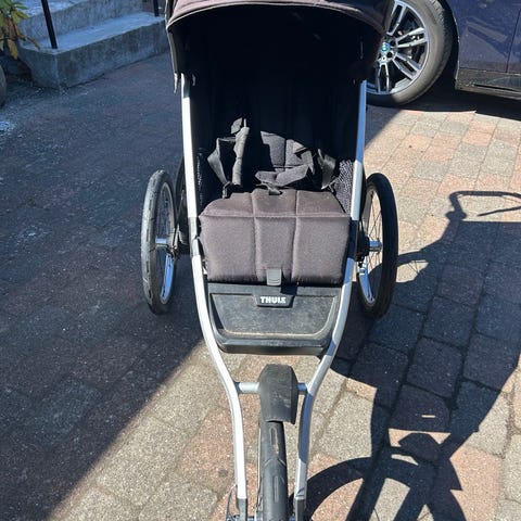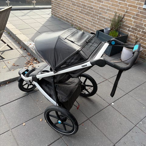 Løbevognen er meget let og behagelig at løbe med. Den sælges udelukkende da vi skal have en løbe/cykeltrailer i stedet.
