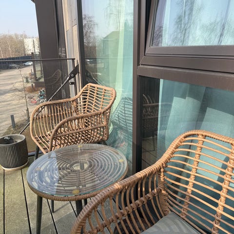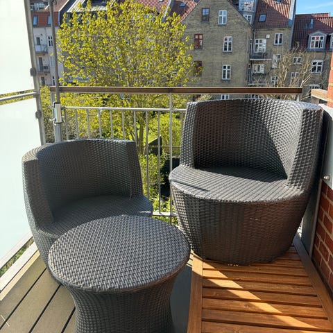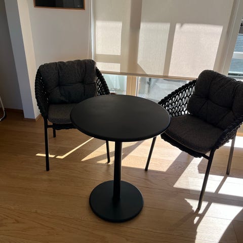 Have-/altanmøbelsæt med to grå stole og rundt bord