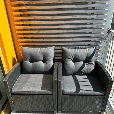 Havesæt bestående af et loungesæt med 2 loungestol og bord. Møblerne er udført i grå-sort flet med matchende grå hynder. Sættet er egnet til terrasse eller altan som afslapningsområde udendørs.