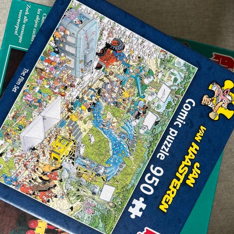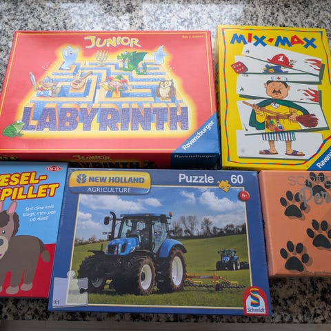 7 stk. børnepuslespil sælges samlet. Blanding af mærker (bl.a. Ravensburger, Larsen og Jan van Haasteren) med motiver som dyr, biler, traktorer og superhelte. Ca. 60–240 brikker. Alle puslespil er komplette med alle brikker og fremstår i pæn stand.