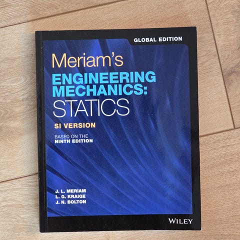 Engineering Mechanics Statics lærebog, Sixth Edition, af J. L. Meriam og L. G. Kraige. Bogen er på engelsk og omhandler statik inden for ingeniørmekanik. Egnet som studiebog til videregående uddannelser inden for teknik og ingeniørfag, hvor der arbejdes med kræfter, ligevægt og analyse af mekaniske systemer. Udgivet af Wiley.