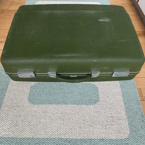 Peli Storm Case iM295, olivengrøn med nogle år og destinationer på bagen.