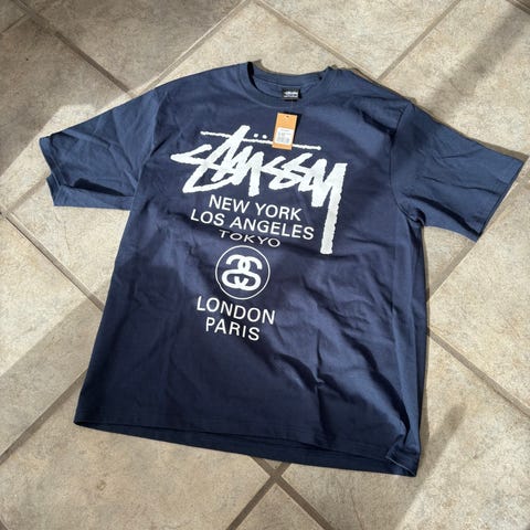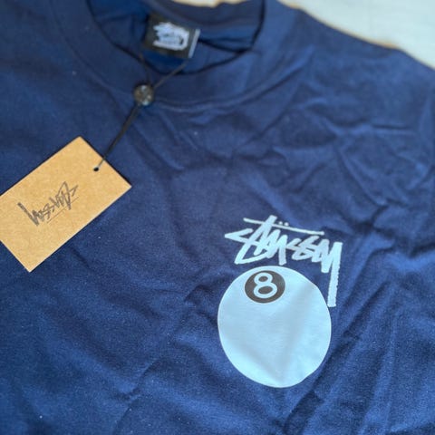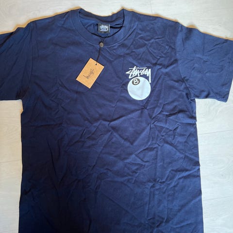 Stüssy T-shirt til herre i størrelse M. T-shirten er sort og fremstillet i bomuld. Den har rund hals og kortærmet design. På brystet er der Stüssy-logo print, og på ryggen et større Stüssy-logo med terningegrafik. Velegnet som hverdags- og fritidstøj.