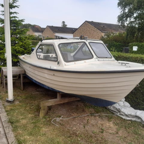 Båden er 5 m lang og i rimelig stand. Kalechen er slidt men tæt og fungerer.