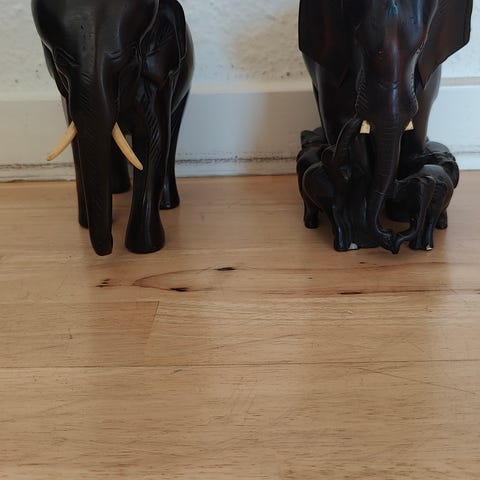 Elefanterne fremstår med patina og brugsspor, og de har ikke et helt “perfekt” eller poleret udtryk. Overfladerne er lidt matte og varierede, hvilket giver dem karakter og et mere autentisk vintage look.