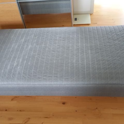 Enkelt velholdt seng med topmadras og fire træben. Sengen har en grå ramme og en lys, rillet topmadras. Træbenene er lyse og monteres med gevind. Velegnet som enkeltseng i soveværelse, gæsteværelse eller ungdomsværelse. Købt i sengeforretningen Seng (sengen er vist deres eget mærke). Boksmadrassen er 30 cm høj + ben.