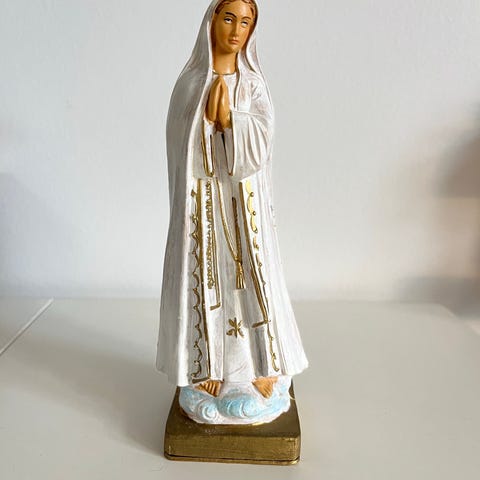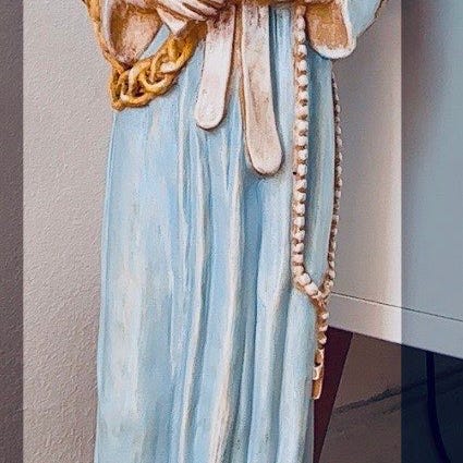 Religiøs statue af jomfru Maria med rosenkrans. Figuren forestiller Maria stående med foldede hænder og en detaljeret rosenkrans hængende ned langs kjolen. Statuer som denne bruges ofte til dekoration i hjem, kirkerum eller bederum. Materiale og mål er ikke oplyst og bør kontrolleres ved interesse.