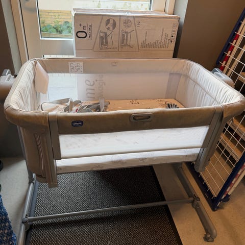 Vuggen står på et fritstående stativ med fire ben og kan vugge fra side til side. Den er let at flytte og har bløde sider med netpaneler, der giver ventilation og mulighed for at se barnet.