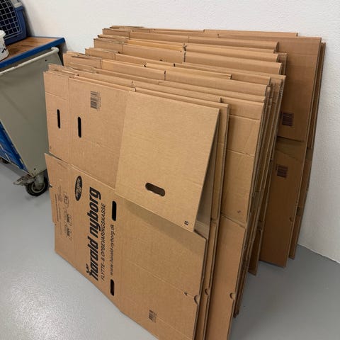 Der er ca. 70 kasser, og de fleste har kun været brugt en gang!
