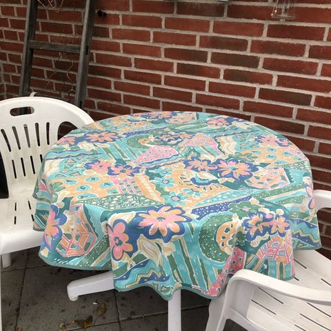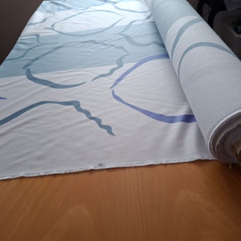 Veltex metervare stof i bomuld og akryl. Stoffet er trykt med et abstrakt, flerfarvet mønster i blå, grønne og orange nuancer på lys bund. Leveres på rulle og egner sig til fx boligtekstiler som gardiner, duge eller pudebetræk afhængigt af mål og behov. Materialet kan vaskes ifølge vaskeanvisningerne på mærket.