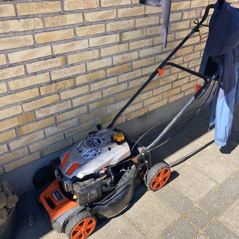 Plæneklipper / græsslåmaskine på benzin med sideudkast. Tankdækslet er gået i stykker.