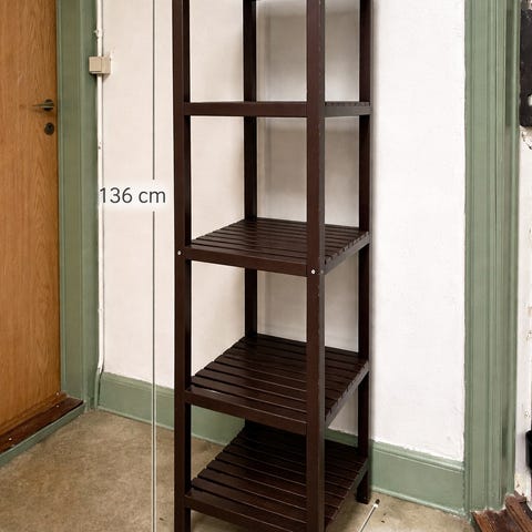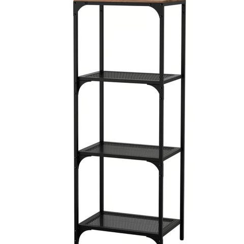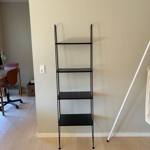 IKEA reol med metalstel og hylder i trælook. Reolen har en højde på ca. 136 cm og en bredde på ca. 93 cm samt en dybde på ca. 36 cm. Konstruktionen består af sortlakeret metalramme med perforerede metalhylder nederst og hylder i trælook øverst. Velegnet til opbevaring i stue, kontor eller andre rum, hvor der er behov for åbne hylder til bøger, dekoration eller kasser.