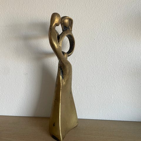 Skulptur/figur i messing med abstrakt, fuglelignende form. Figuren står på en firkantet fod og er slank og høj. Den er velegnet som dekoration på hylde, reol eller bord i stue, entré eller kontor. Materialet er massiv messing med synlige brugsspor på bunden. Ingen synlig mærkning af producent eller designer.