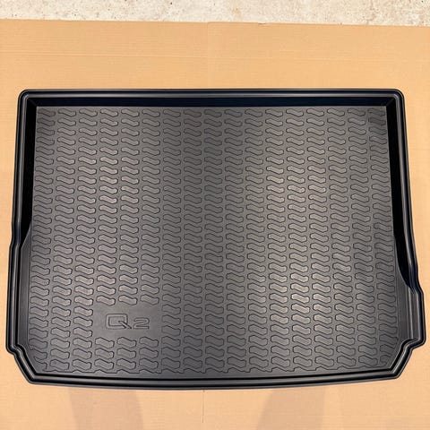 Audi Q4 bagagerumsbakke i sort gummi. Bakken er formstøbt med kant hele vejen rundt og har rillet overflade, der er egnet til at opsamle snavs og væske. Passer til bagagerummet i Audi Q4-modeller, hvor der er behov for en praktisk og rengøringsvenlig bundbeskyttelse.