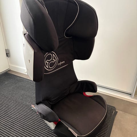 Cybex Solution Q3-fix autostol i mørkeblå. Autostolen har høj ryg og justerbar hovedstøtte, som giver støtte til barnets hoved og overkrop. Sædet har armlæn og polstret betræk. Velegnet til montering i bilens bagsæde med bilens sikkerhedssele. Manual medfølger som vist på billedet.