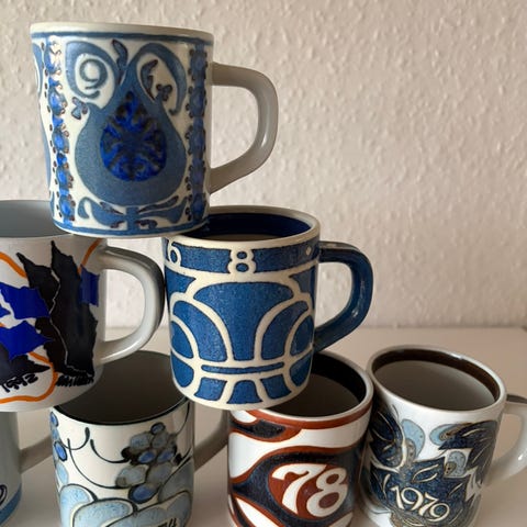 Royal Copenhagen krus 1998 i hvid porcelæn med håndmalet/blå og rød abstrakt dekoration. Bunden er stemplet med Royal Copenhagen-mærke og modelnummer. Det er uden metalplade.