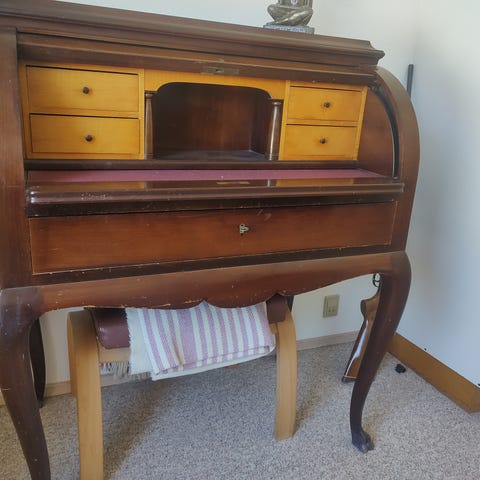 Gammelt chatol med 1 stor skuffe samt 2 små skuffer. Klap kan skydes ned og skjule hylder og skuffer.