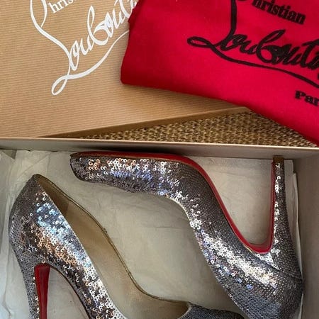 Meget smukke stiletter, som er blevet brugt i forbindelse med bryllup under receptionen. Ingen tegn på brug ved hæl eller glitter materialet, alene under sålen.
