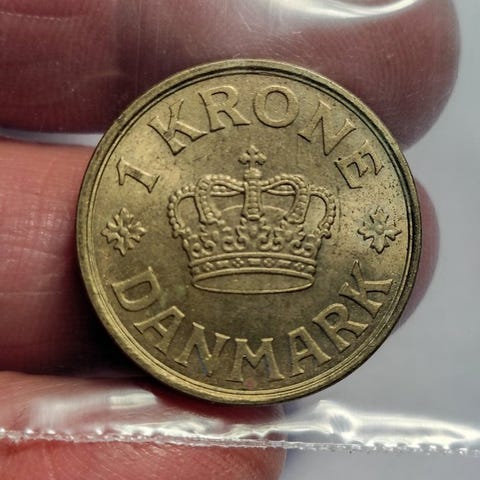 # 1-krone # 1-kroner # en # en-kroner # enkroner # kr. # kr # sølvmønt # sølvmønter # delfin # delfiner