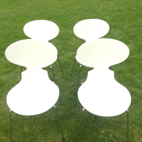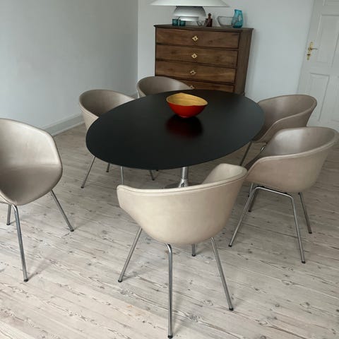 Arne Jacobsen, Jubilæumssæt 100 års, Bord, 3 stole & loftlampe, Arne Jacobsen jubilæumssæt bestående af æggeformet bord, model FH 3603 med plade i sortlaseret ask monteret med tre ben af forkromet stål. Samt sæt på tre skalstole, model 3100 "Myren" med formbøjede skaller i sortlaseret ask med tre ben.