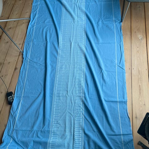 103x104 cm. Flot vævet dug. Har et smuds i det ene hjørne. Se billedet.