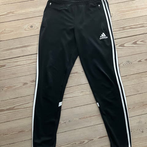 Adidas fodbold træningsbukser til herre i størrelse XXL. Bukserne er slim fit med tilspidsede ben og fuld længde. De er blå med hvide striber langs siderne. Velegnede til fodbold og anden sportstræning.
