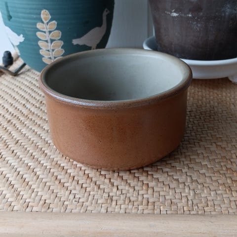 Fransk lertøj med brun glasur udvendigt og lys cremefarvet glasur indvendigt. Skålen har en rund form med let udadbuet kant og er egnet til servering.