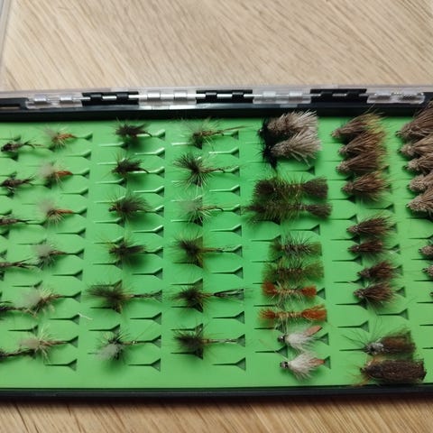 Hjemme bundet kystfluer 15 styks i plast æske/fluebox.