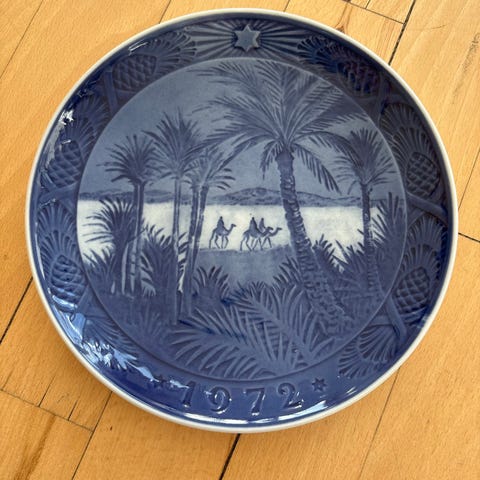 7 Royal Copenhagen juleplatte i porcelæn i blå og hvid dekoration. Motiverne viser forskellige jule- og vintermotiver med årstal præget i kanten, fra 1972 til 1977. Tallerkenerne er runde og udført i glaseret porcelæn med reliefmønster. Velegnet som samlerobjekter eller til dekoration på væg eller bord hele året eller i juletiden. Stykpris 50,-kr. byd for samlet pris.