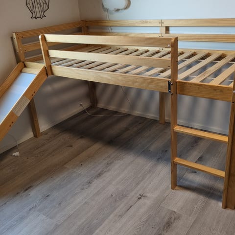 Halvhøj seng der er 90x200 med rutsjebane, den fungere rigtig fint, men man kan godt se den er godt brugt (se billeder). Det er dog ikke originale skruer alle steder og der mangler en enkelt pind i den ene ende derfor den billige pris.