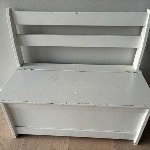 Sød hvidmalet slagbænk/børnebænk med opbevaring. Bænken har nogle mærker og slidtage, som ses på billederne. Men samlet set giver det et fint indtryk med pæn patina.